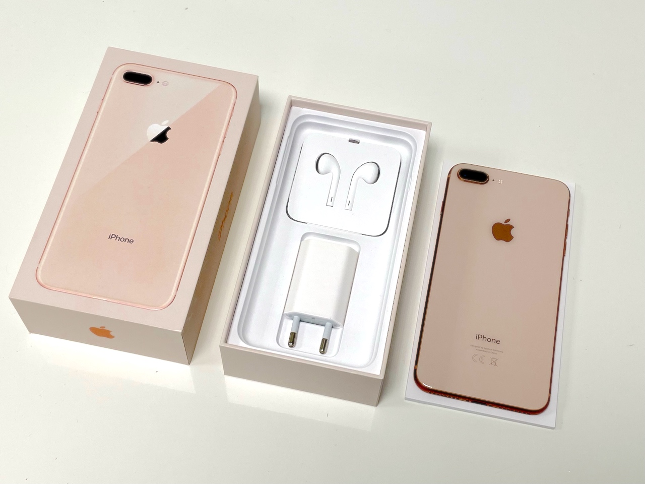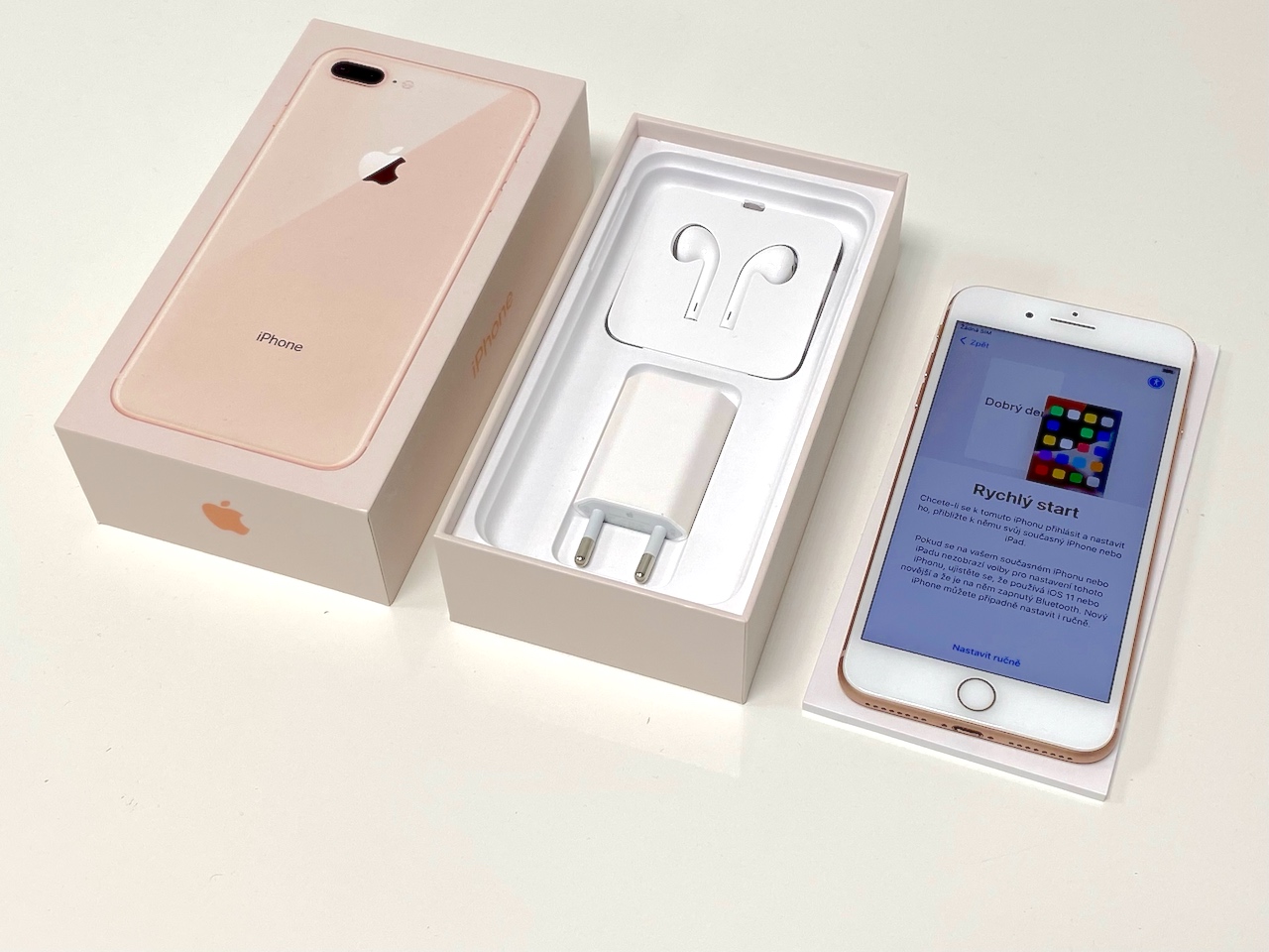 prodám iPhone 8 Plus 256GB, růžově zlatý, výborný stav (jako nový) včetně nové nabíječky, nepoužitá sluchátka, baterie 89%, v originální krabičce, zdarma nové ochranné sklo.